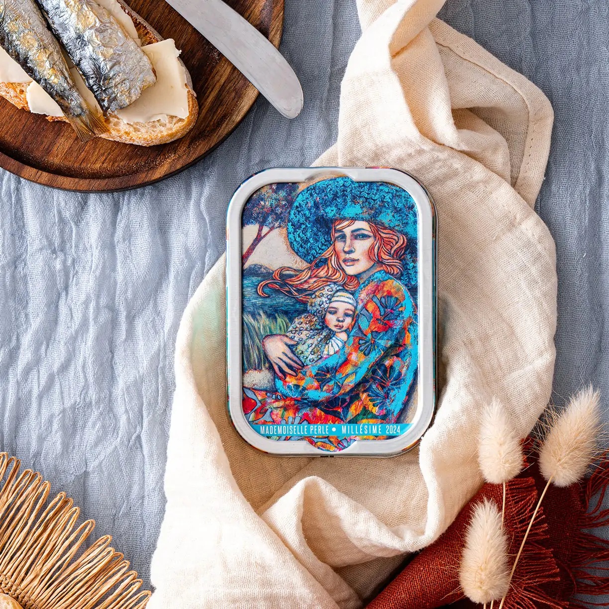 Mademoiselle Perle wiegt ihren Sohn Ulysse zärtlich in einer Umarmung voller Sanftheit und mütterlicher Liebe. Eine Kreation von Delphine Cossais, um unseren 20. Jahrgang, den Cru 2024, zu würdigen. Eine raffinierte Verpackung, in der die Sardinen sanft mit nativem Olivenöl extra mariniert werden.